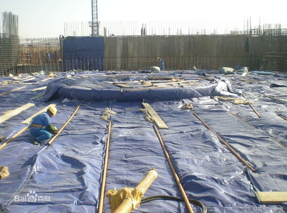 混凝土節(jié)水保濕養(yǎng)護(hù)膜是以新型可控高分子材料為核心,以塑料薄膜為載體,粘附復(fù)合而成,高分子材料可吸收自身重量200倍的水分,吸水膨脹后變成透明的晶狀體,把液體水變?yōu)楣虘B(tài)水,然后通過毛細(xì)管作用,源源不斷地向養(yǎng)護(hù)面滲透,同時(shí)又不斷吸收養(yǎng)護(hù)體在混凝土水化熱過程中的蒸發(fā)水。因此在一個(gè)養(yǎng)生期內(nèi)養(yǎng)護(hù)膜能保證養(yǎng)護(hù)體面保持濕潤,相對濕度大于或等于90%,有效抑制微裂縫,保證工程質(zhì)量。