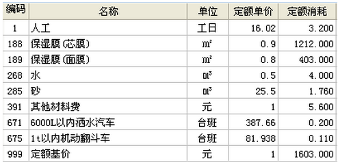 工程內(nèi)容:①草袋養(yǎng)生:鋪草袋、灑水、收草袋、搬運(yùn);②保濕膜養(yǎng)生:灑水、鋪芯膜、鏟砂壓膜、收膜、搬運(yùn)。