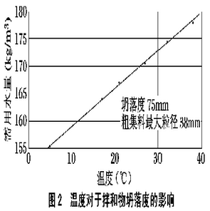 混凝土拌和物的和易性施工經(jīng)驗告訴我們,在炎熱天氣下同樣材料制成同等稠度的混凝土拌和物總要比寒冷天氣多用一些水。同樣拌和物的坍落度確實是隨著它的溫度升高而減小的。試驗結果顯示,為了使一般混凝土拌和物具有相等的坍落度(75mm),拌和物的溫度每升高10℃,每1m3就需要增加約7kg的拌和用水(見圖2)。