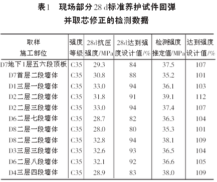 當工程連續(xù)幾天出現(xiàn)混凝土試件不合格時,很容易 使現(xiàn)場人員感到緊張,往往總監(jiān)理工程師會要求對實體混凝土進行檢測,以確定該段實體混凝土的強度是否合格。檢測一般采取對實體混凝土回彈加鉆芯取樣修正的方法,來判定混凝土是否合格,這種情況費用較高。以該工程為例:通過對2010年11月11日之前的11段混凝土進行現(xiàn)場檢測,結(jié)果判定混凝土全部合格(表1)。