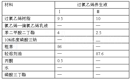 常用塑料薄膜養(yǎng)護劑有氯乙烯—乙烯養(yǎng)護劑和過氯乙烯樹脂塑料薄膜養(yǎng)護劑。前者為市售產(chǎn)品,后者為多種原料現(xiàn)用現(xiàn)配,配合比參考表如下: