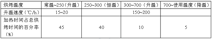 ? 用耐火混凝土澆筑的熱工設(shè)備,必須在混凝土強度達到設(shè)計強度的70%時,方準(zhǔn)進行烘烤。烘烤溫度見下表一。