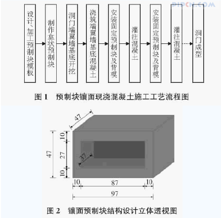 在端翼墻式洞門墻體施工時,用事先預(yù)制好的盒狀預(yù)制塊砌放在墻體表層,預(yù)制塊既是現(xiàn)澆混凝土的鑲面層,又是現(xiàn)澆混凝土的模板,砌放一層預(yù)制塊澆筑一層混凝土,直到設(shè)計高度。盒狀預(yù)制塊既能減輕預(yù)制塊的重量,便于搬運(yùn)安裝,又能與現(xiàn)澆混凝土鑲嵌牢固。