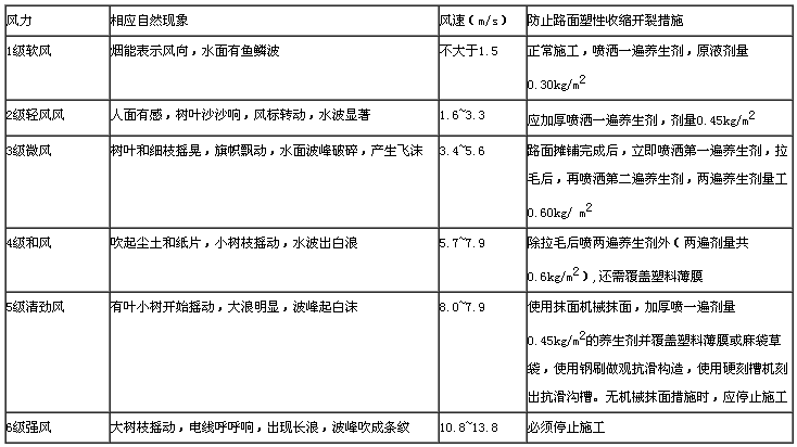 風(fēng)天應(yīng)采用風(fēng)速計(jì)在現(xiàn)場(chǎng)定量測(cè)風(fēng)或觀測(cè)自然現(xiàn)象,確定風(fēng)級(jí),并按下表規(guī)定采取防止塑性收縮開裂的措施。